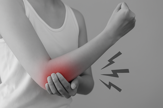症状が重度の場合は肩関節自体にはっきりと出ますが、軽度~中等度の場合、肩関節には症状がない事が多く外側上顆炎の痛みや腕のしびれ等の症状がでます。